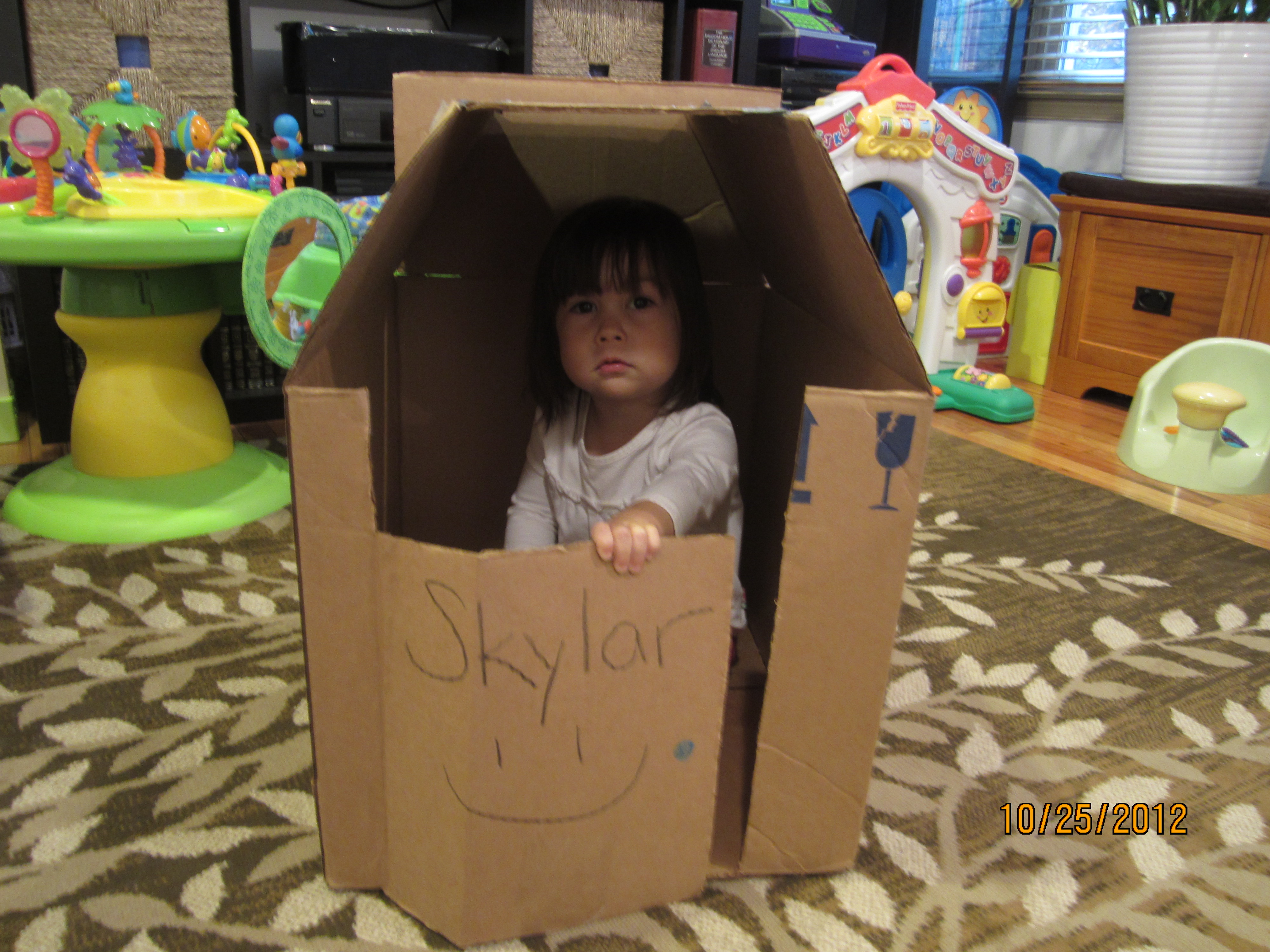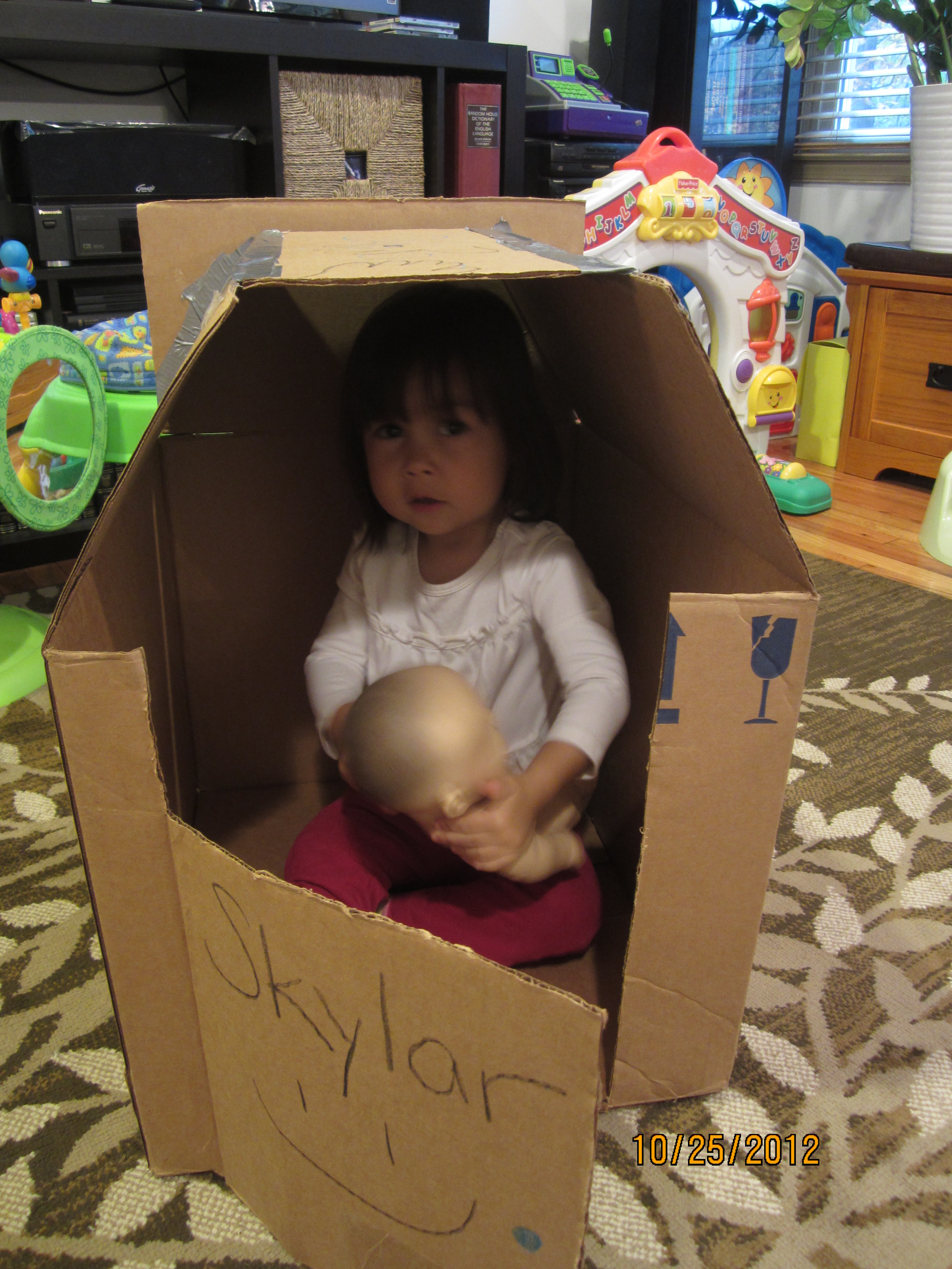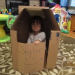 We recently received this huge box in the mail from Diapers.com and I thought it would be a fun morning project to create a little play house for Skylar. 20 minutes, scissors and some duct tape later….voila! She loved it….for 2 whole days 🙂