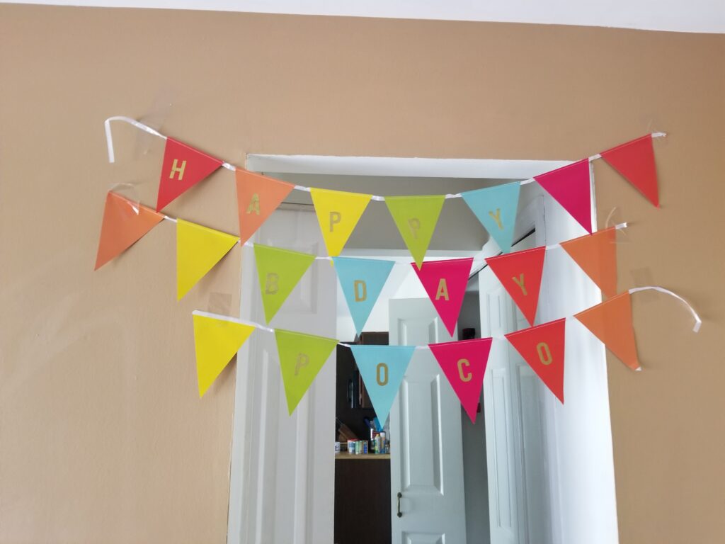 I should have taken more photos, because Parky got lots more fun stuff including a new compound bow and arrow, airsoft guns, and a Captain America aluminum shield. Parker requested an ice cream cake and I decorated the entryway with “Happy Birthday Poco”.
