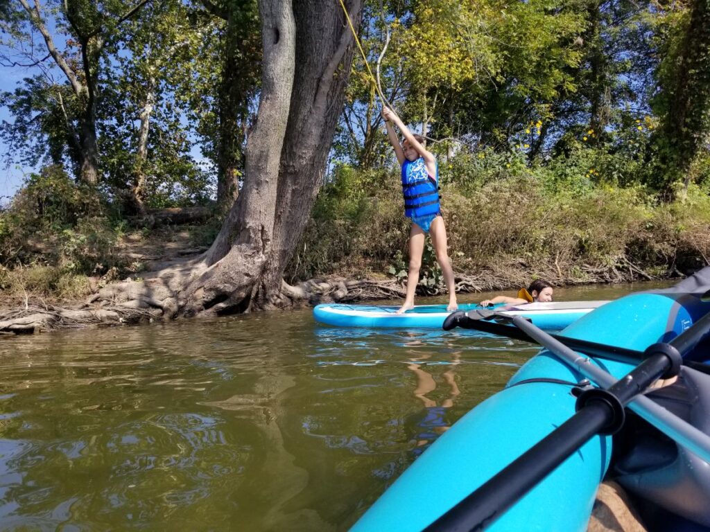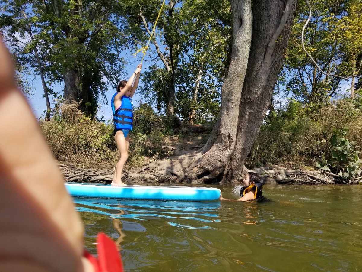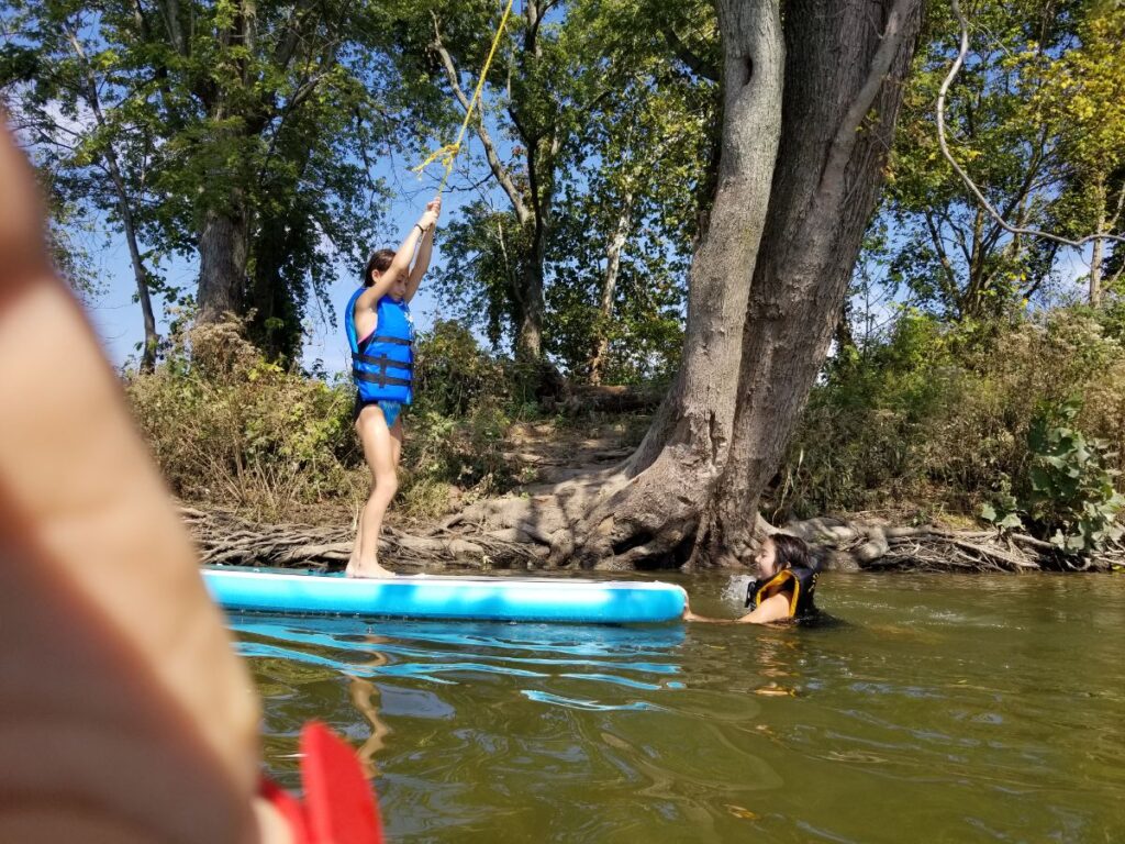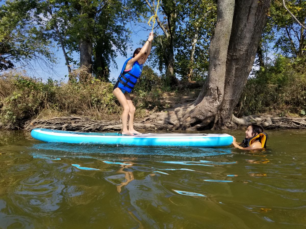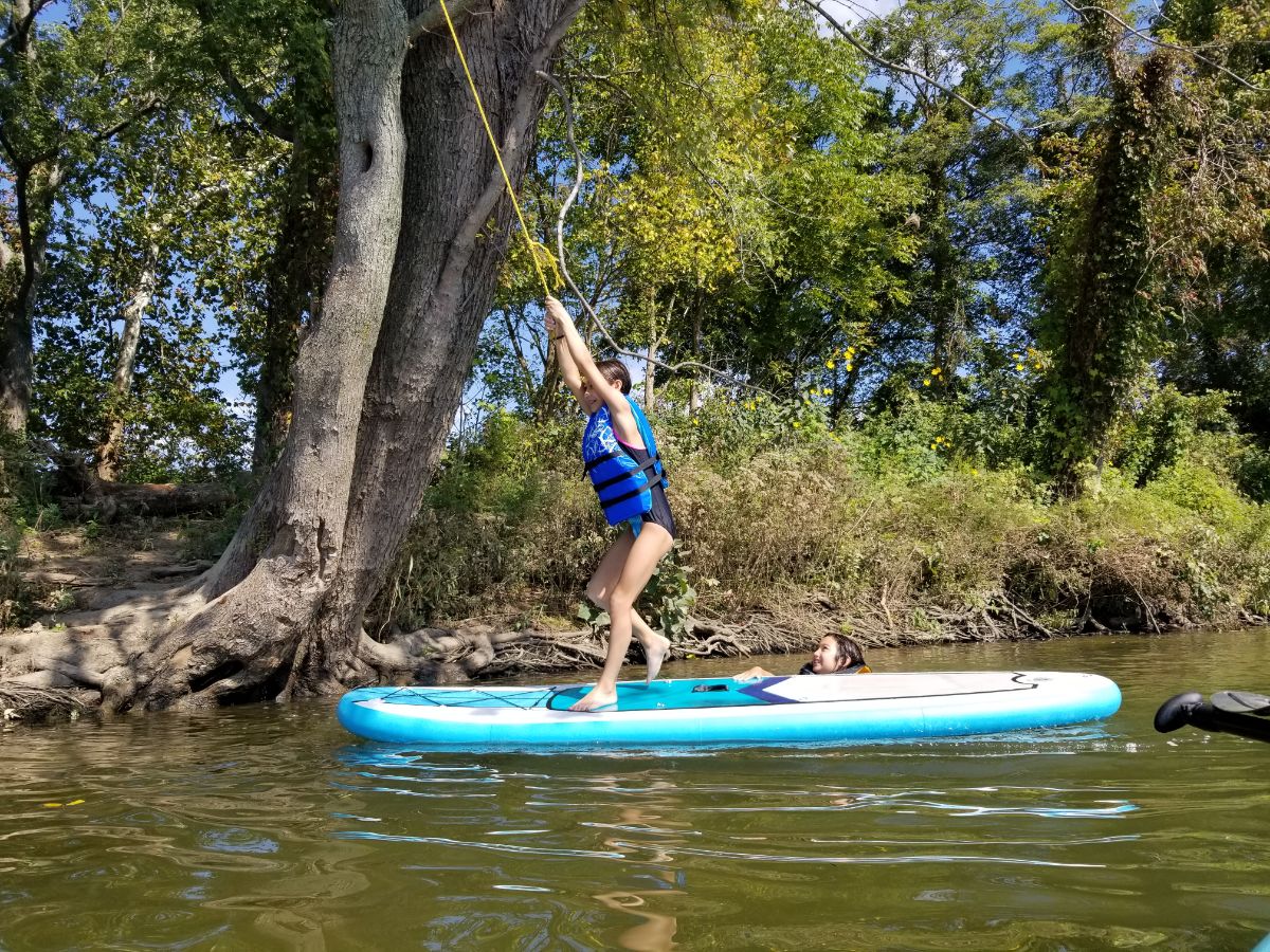 Playing “Water Troll” on the paddle board and rope swing at Algonkian Park