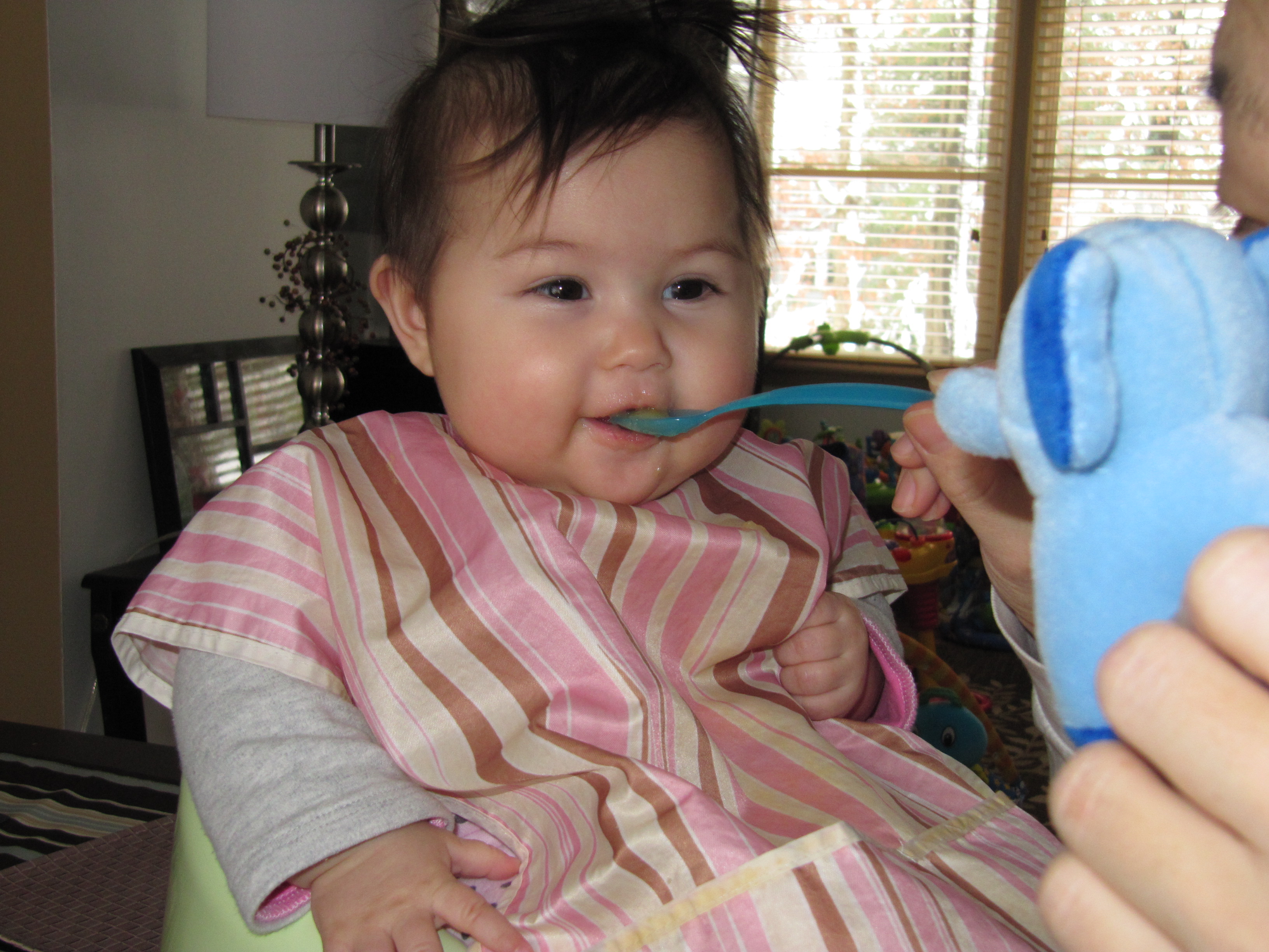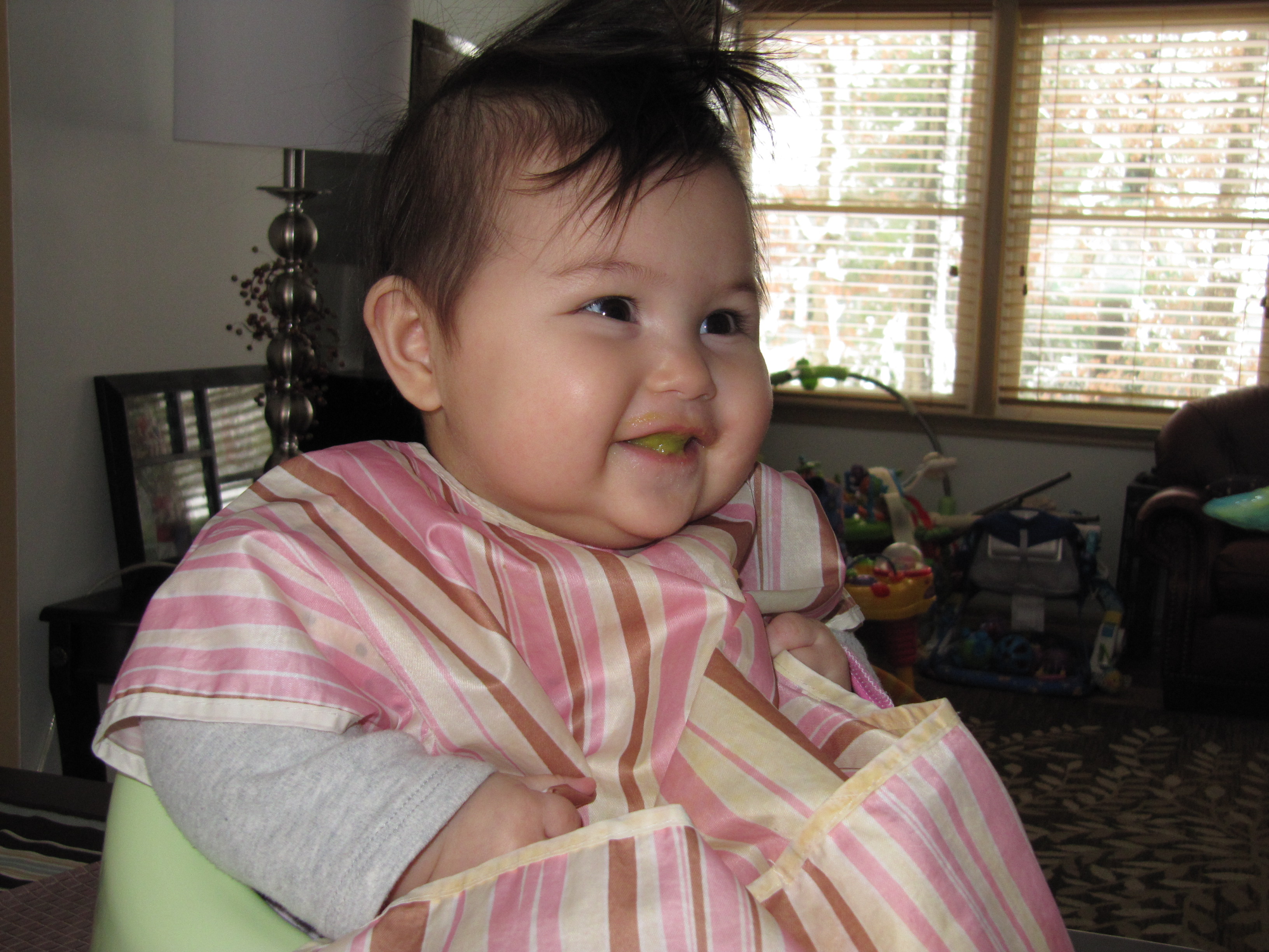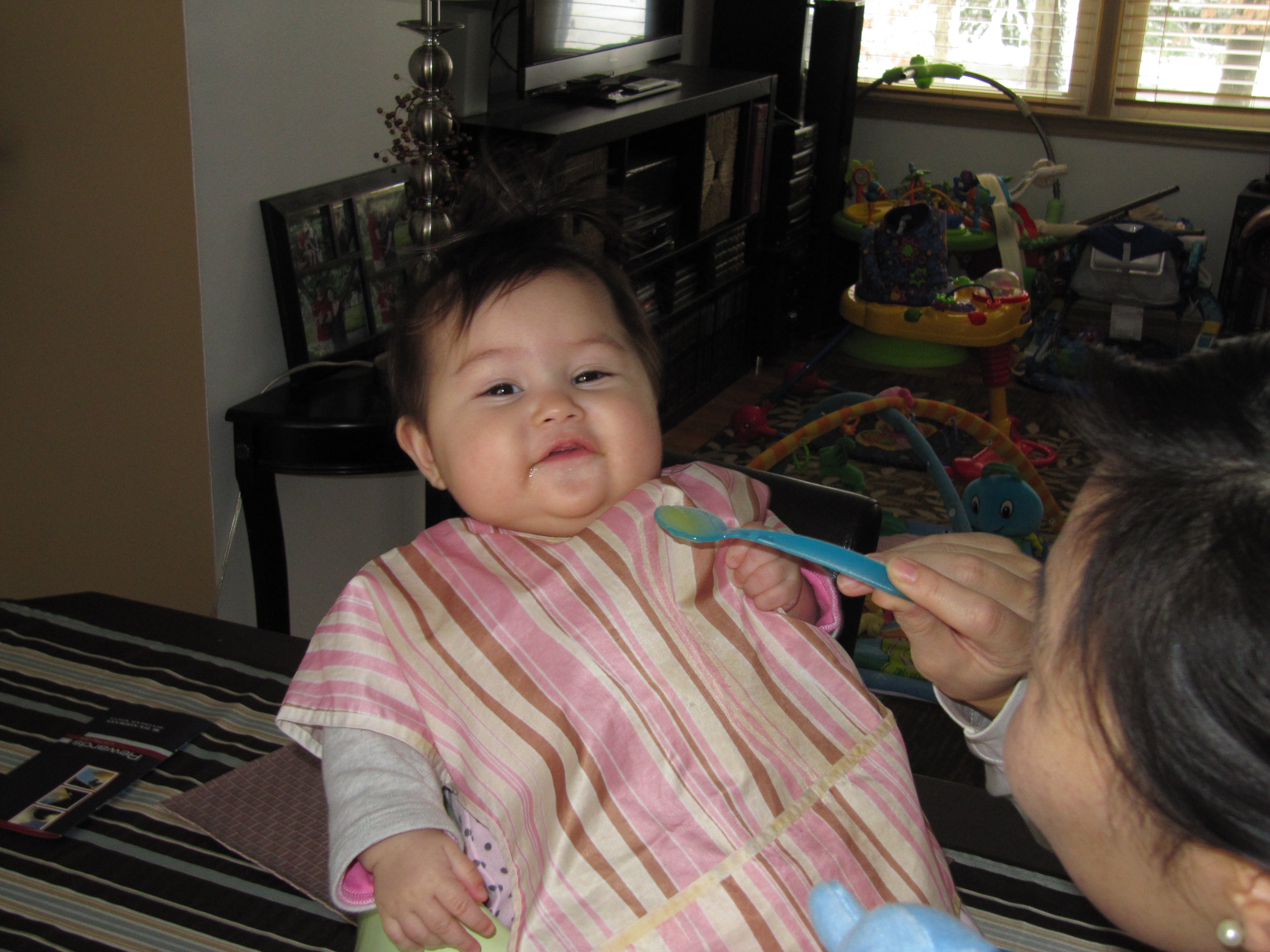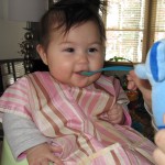 This is not actually her first time eating, but it’s one of the first times. She is wearing a stylish (not) plastic bib which she actually wears (you put her arms through it) to ensure maximum protection against baby food drool. On my usefulness/stylishness index (1-5) it rates about a 3. Who has time to put the baby into this when she is hungry? And it’s hard to wipe down and completely get that mildewy smell out. I’d rather just be able to throw it in the wash so I’ll stick with the good ol’ fashioned cloth bibs.