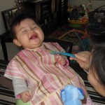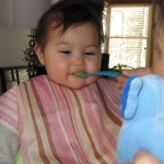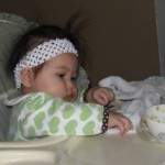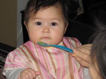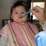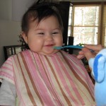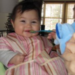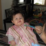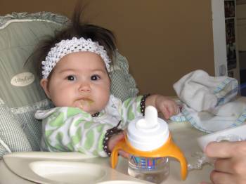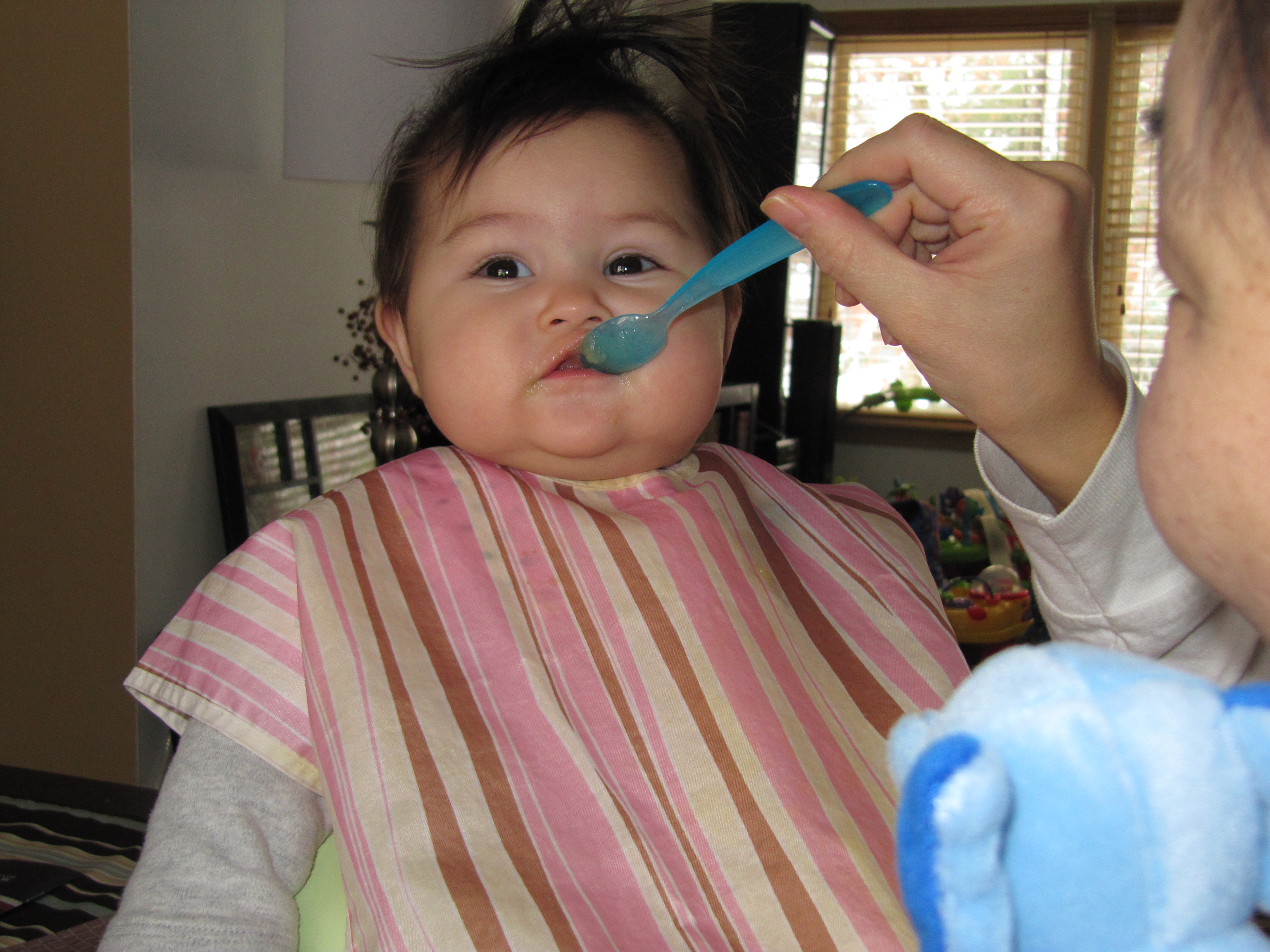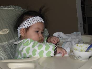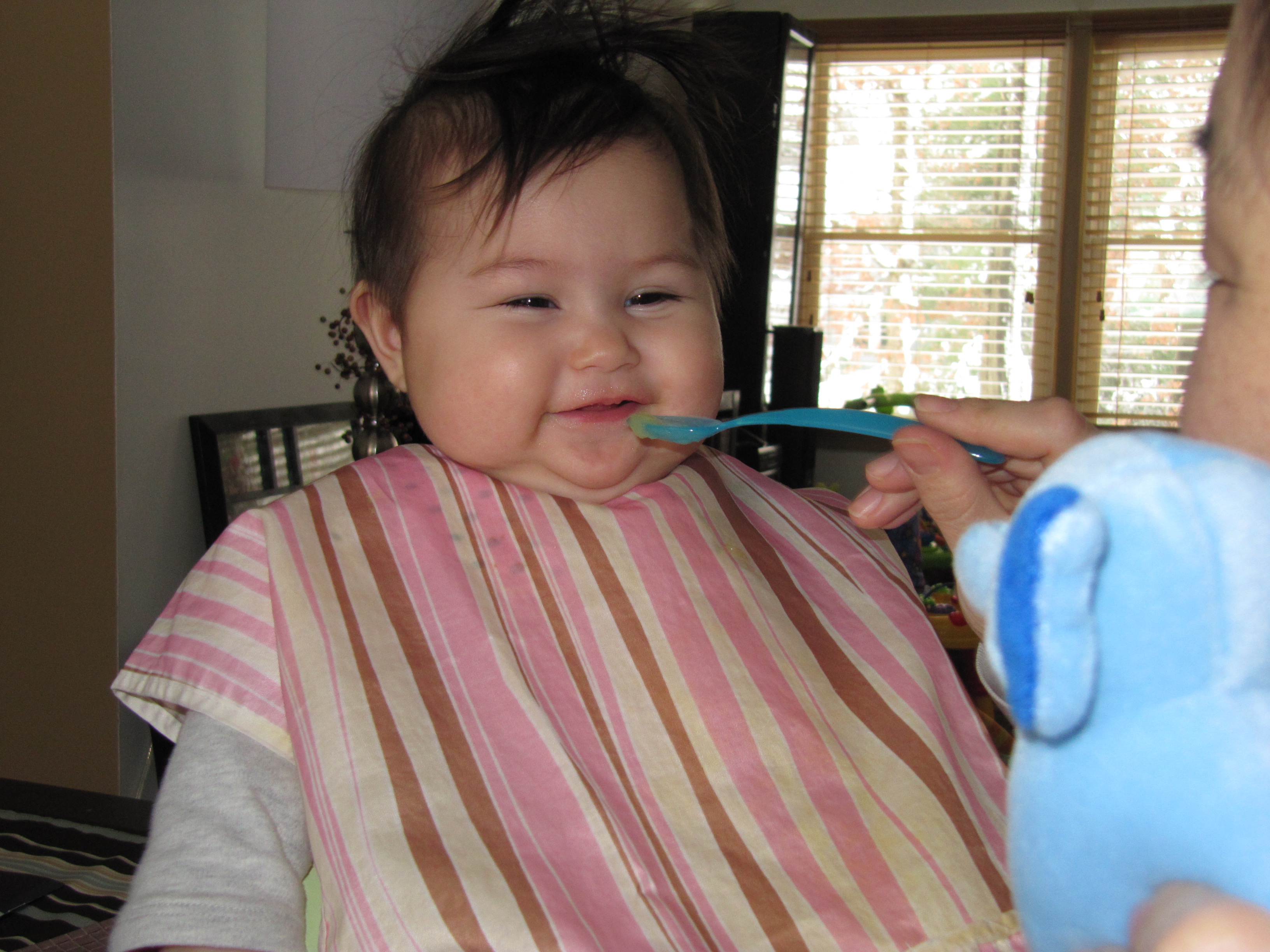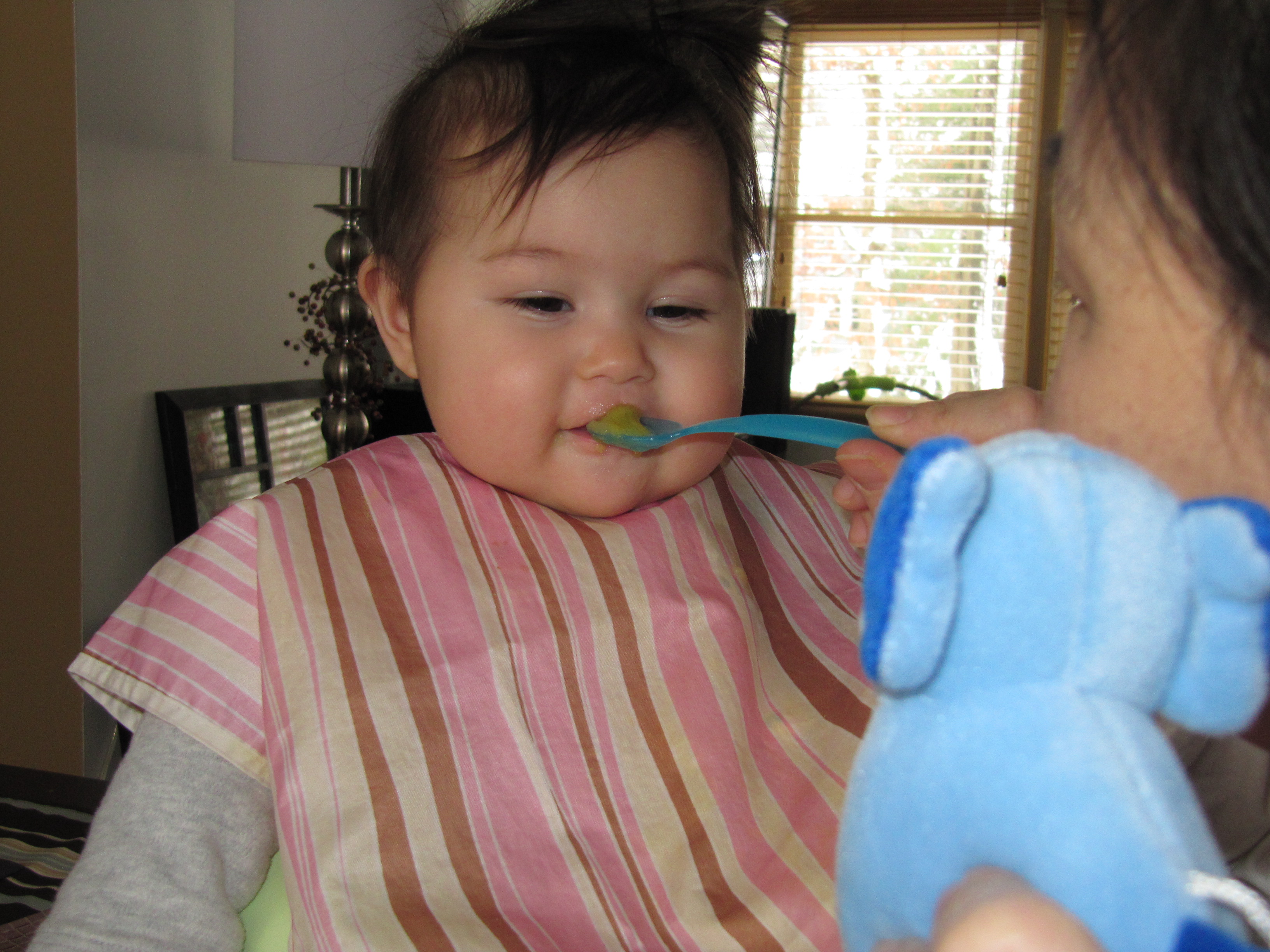 This is not actually her first time eating, but it’s one of the first times. She is wearing a stylish (not) plastic bib which she actually wears (you put her arms through it) to ensure maximum protection against baby food drool. On my usefulness/stylishness index (1-5) it rates about a 3. Who has time to put the baby into this when she is hungry? And it’s hard to wipe down and completely get that mildewy smell out. I’d rather just be able to throw it in the wash so I’ll stick with the good ol’ fashioned cloth bibs.