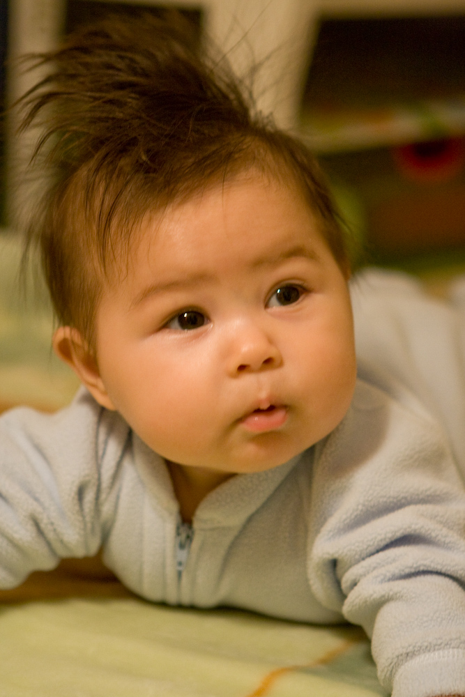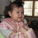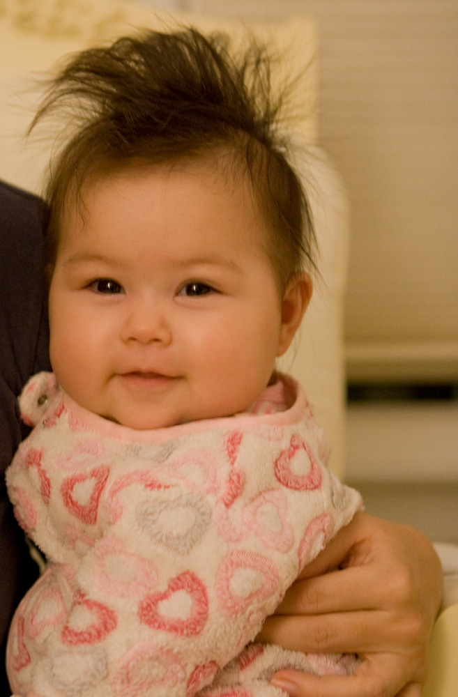 Her hair is still a wierd mohawk-ish patch of long grassy hair on top and short boy-ish hair on the sides. I bought her some teeny little hair clips, but there’s just no good way of taming the little stray hairs and she is constantly mistaken for a boy….