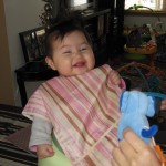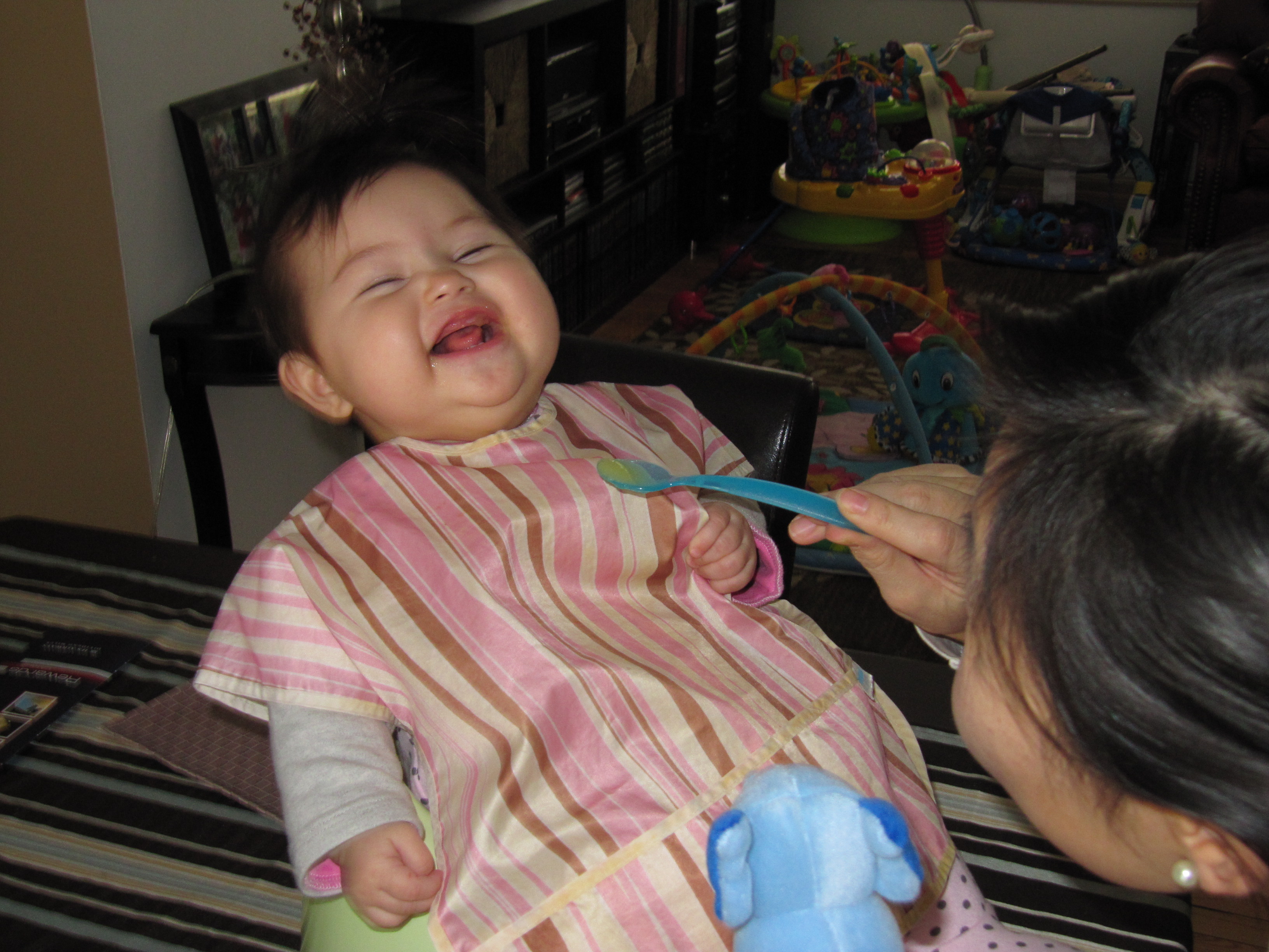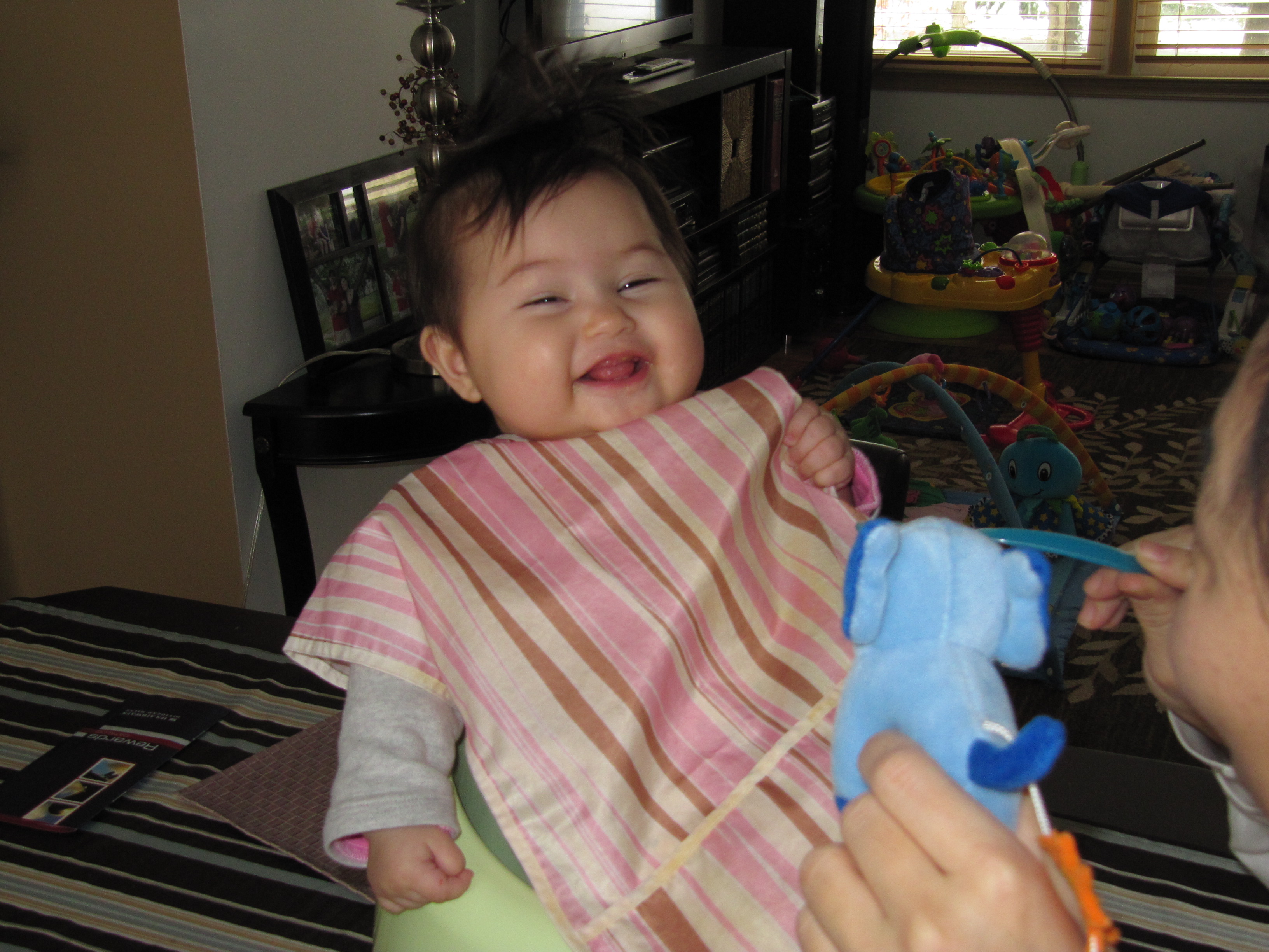 She was a riot – laughing, giggling, and hating – all at the same time. On the menu – green peas. Yummm. Her little funny toy of choice? A small blue elephant, with a trunk that she thinks is hilarious and funny enough, now I think is hilarious.