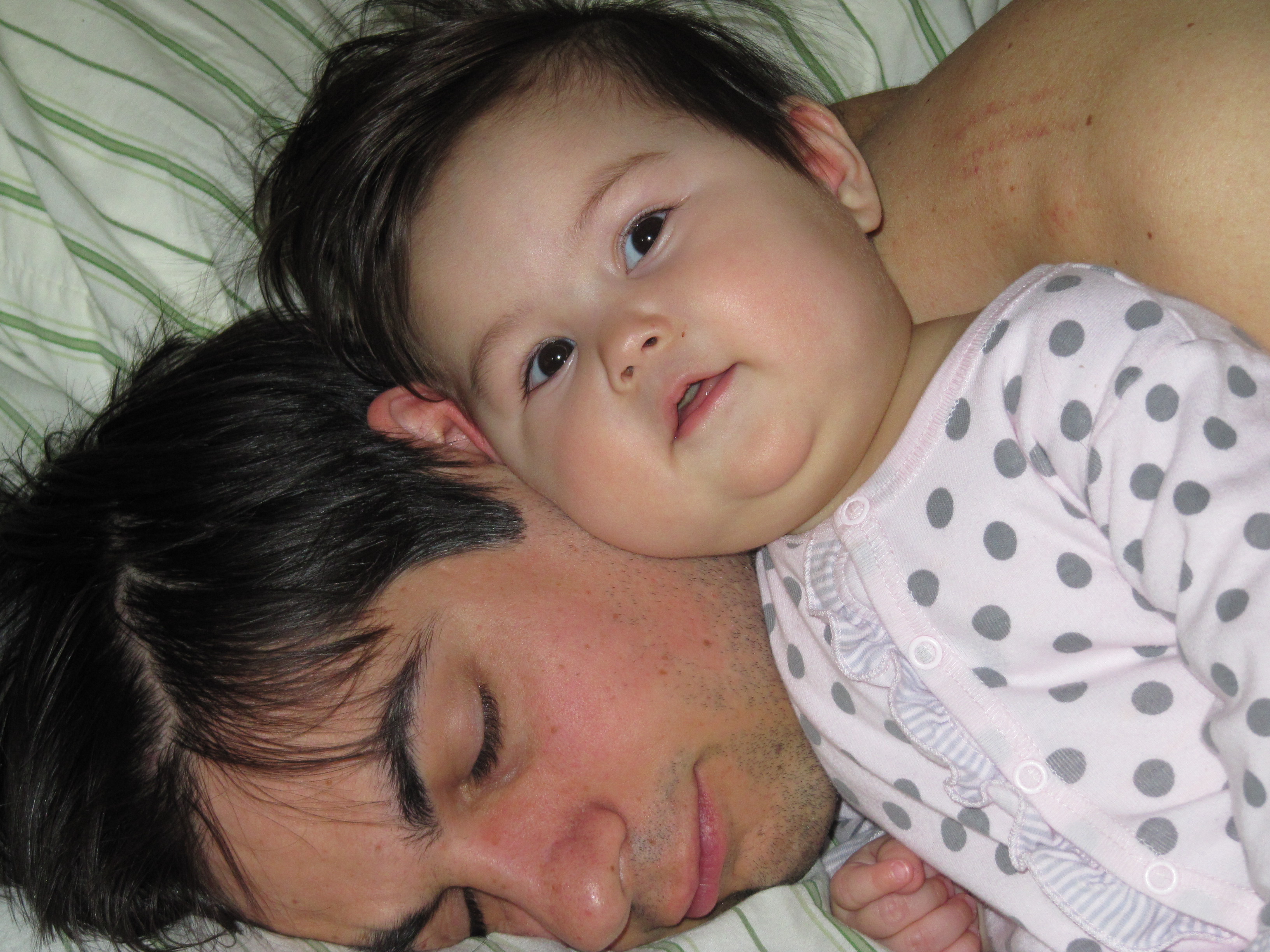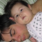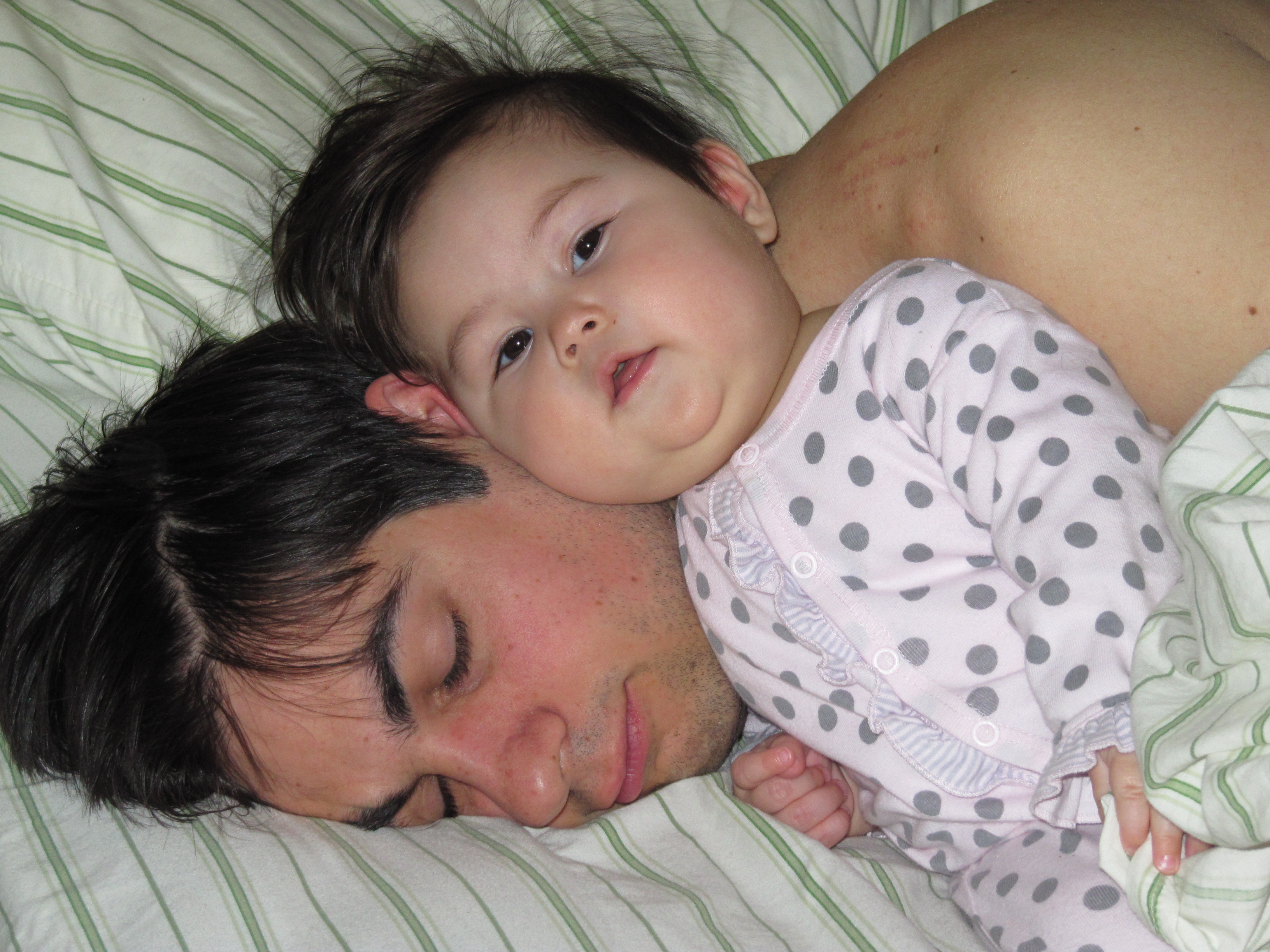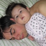 Daddy is having a hard time sleeping lately and is taking little cat naps during the weekend when he can. Here is an example of a Skylar and Daddy cat nap! Somebody is wide awake…..